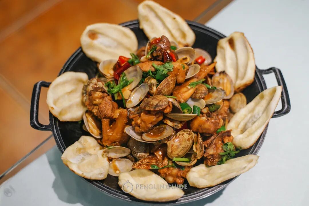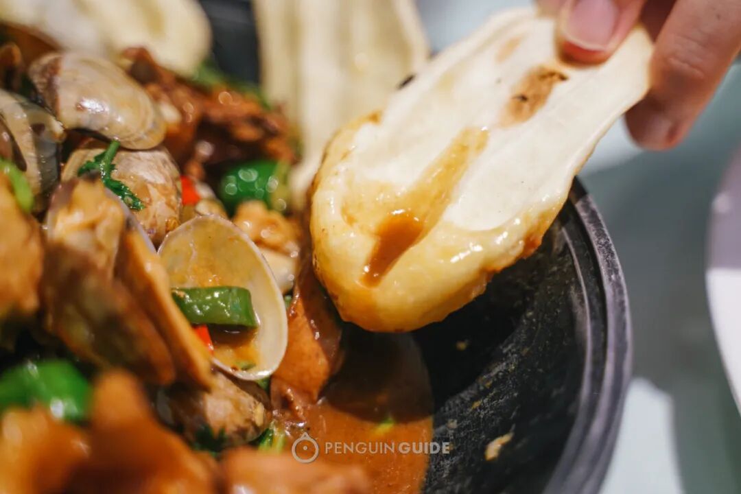 鸡焖鱼、鸡焖蛤,这种海陆结合的绝妙搭配,也会配个饼。