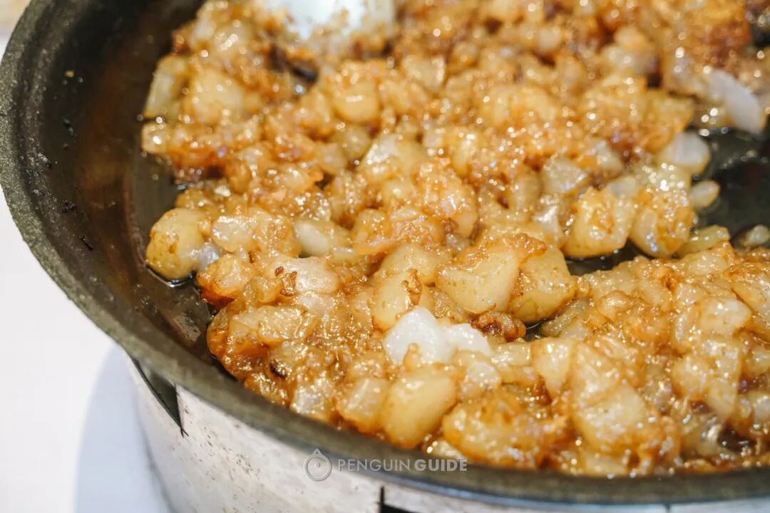 焖子,是北方特有的小吃。用番薯粉制成白色的小方块,然后在大的铁锅面上慢慢煎烤,煎至表面金黄内芯透明出锅,浇上虾油、麻酱。