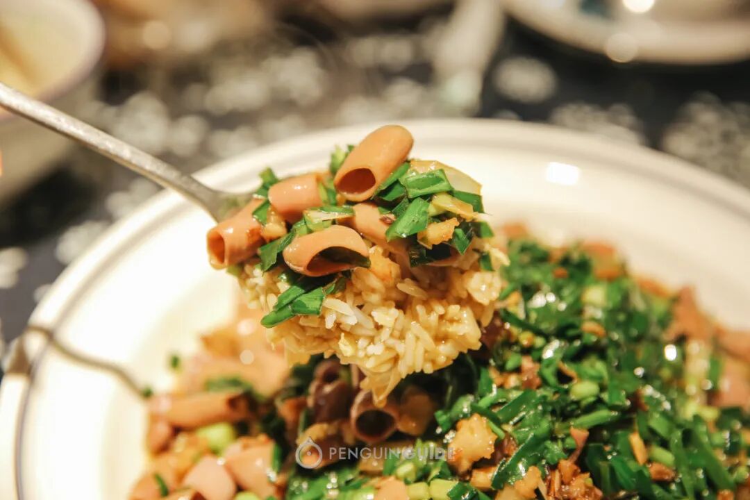 把海肠、韭菜一起爆炒,带着鲜咸的汤汁一起满扑扑地盖在饭上。海肠的弹韧脆嫩,在韭菜和米饭的衬托下更为突出。