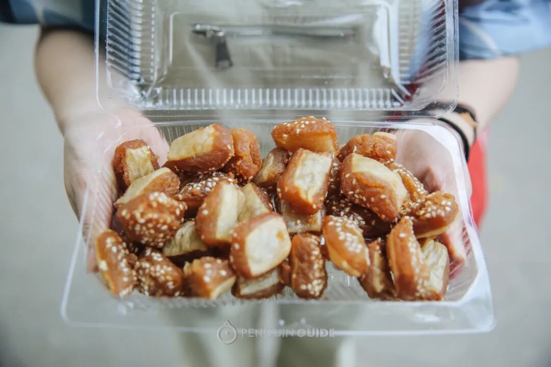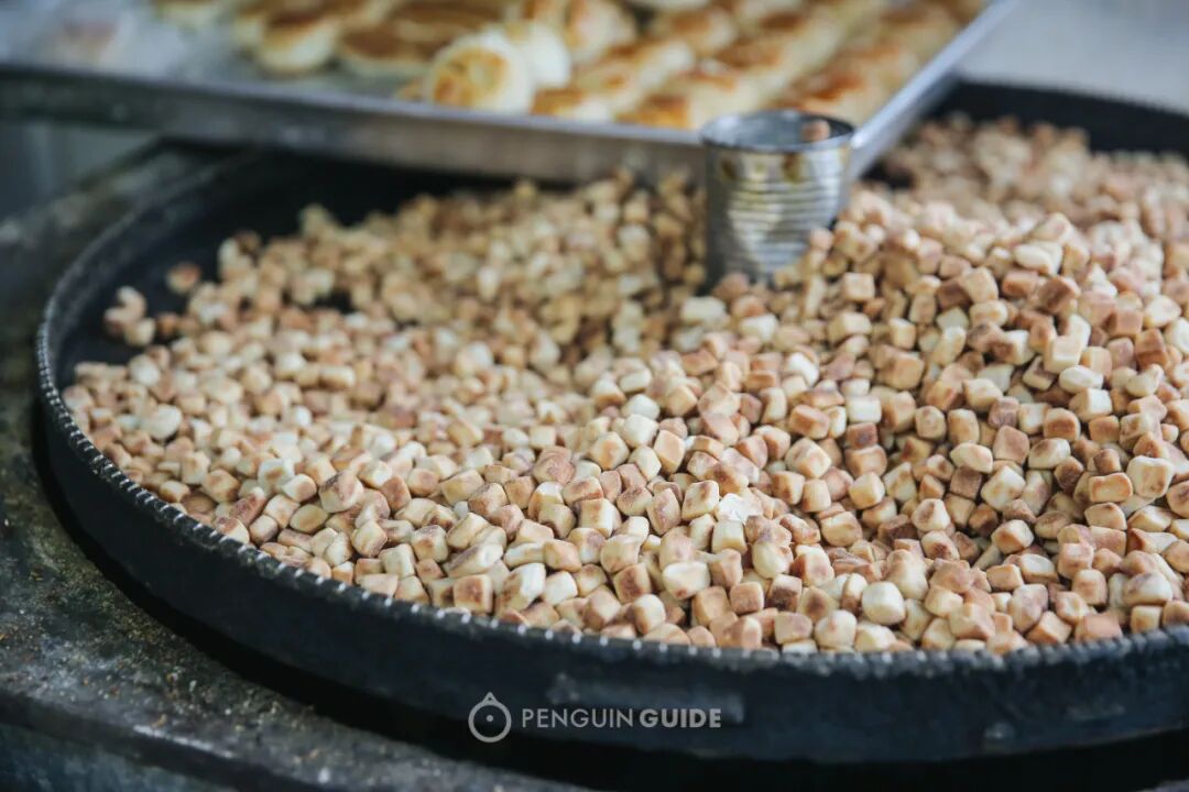 抓果是小小的菱形小丁,一把能抓起好多颗。看起来硬邦邦的,吃起来酥脆、轻盈、微甜,中心还有一点空,严重怀疑旺仔小馒头的灵感是不是来源于抓果!