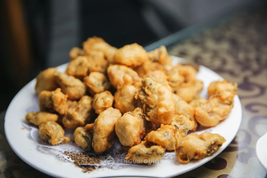 在海蛎子外面裹上鸡蛋面粉,一个一个下锅油炸,一般会炸两次,炸完之后肉金灿灿黄澄澄,面粉裹得很轻薄,仿佛就在肉上面贴了一层膜,脆脆的,吃起来并不油腻。