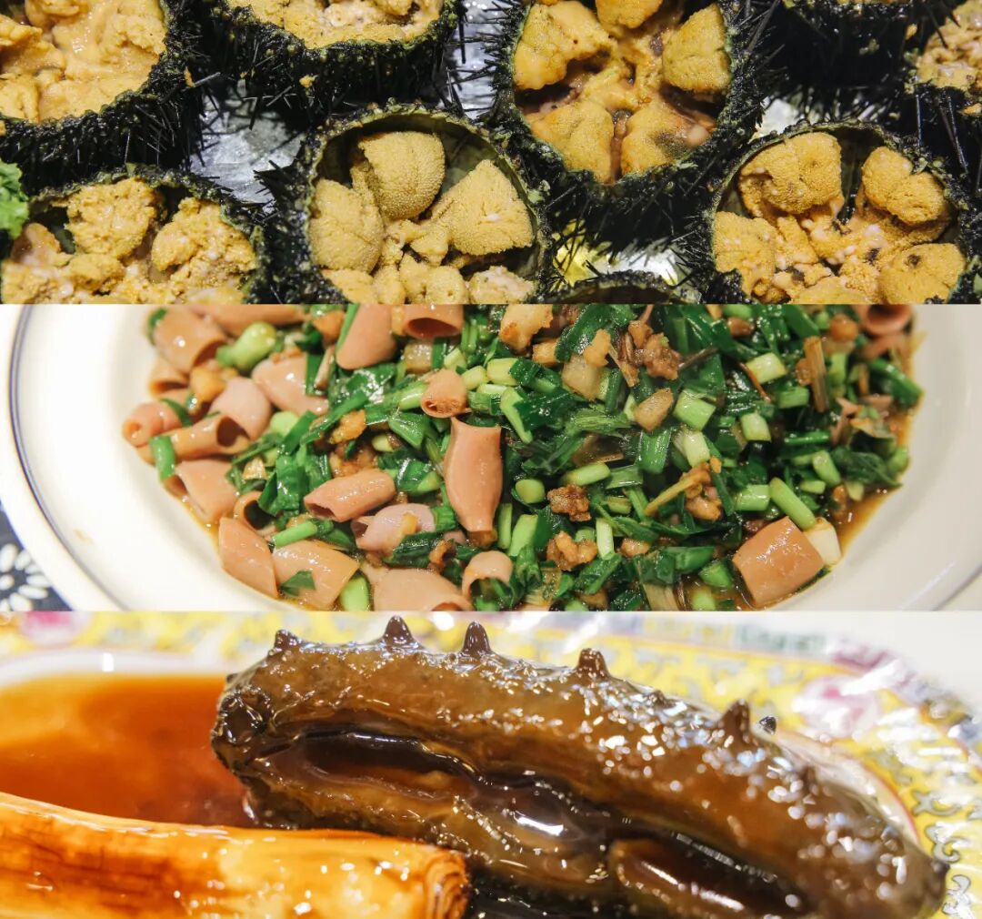 所以来烟台吃海鲜,重头戏当然是“三大海王”——海参、海胆、海肠。这三种名贵海鲜,国内出了渤海湾几乎很少见。