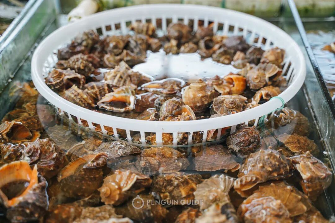 北方常见的小海螺蚍蛴,扁扁的形态,白玉色泽,一般当天现做现卖,提前1-2小时腌制好。