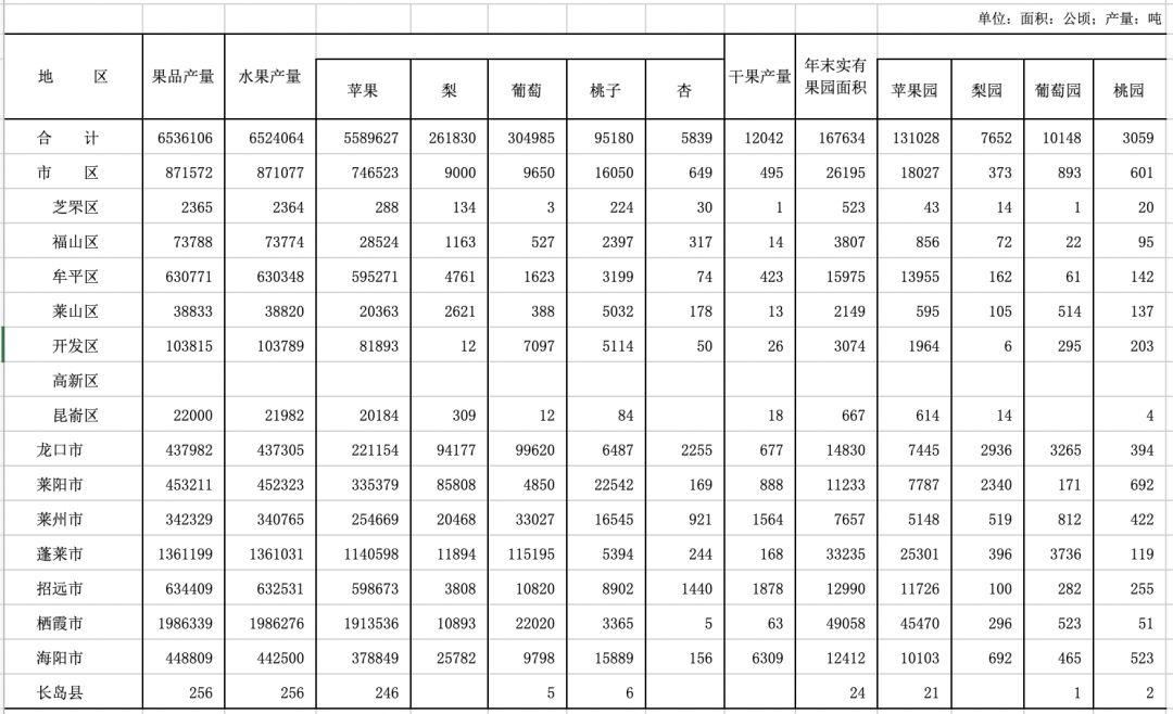看看烟台的水果产量,几百吨几百吨地产👇不仅产量高,品种也非常丰富。