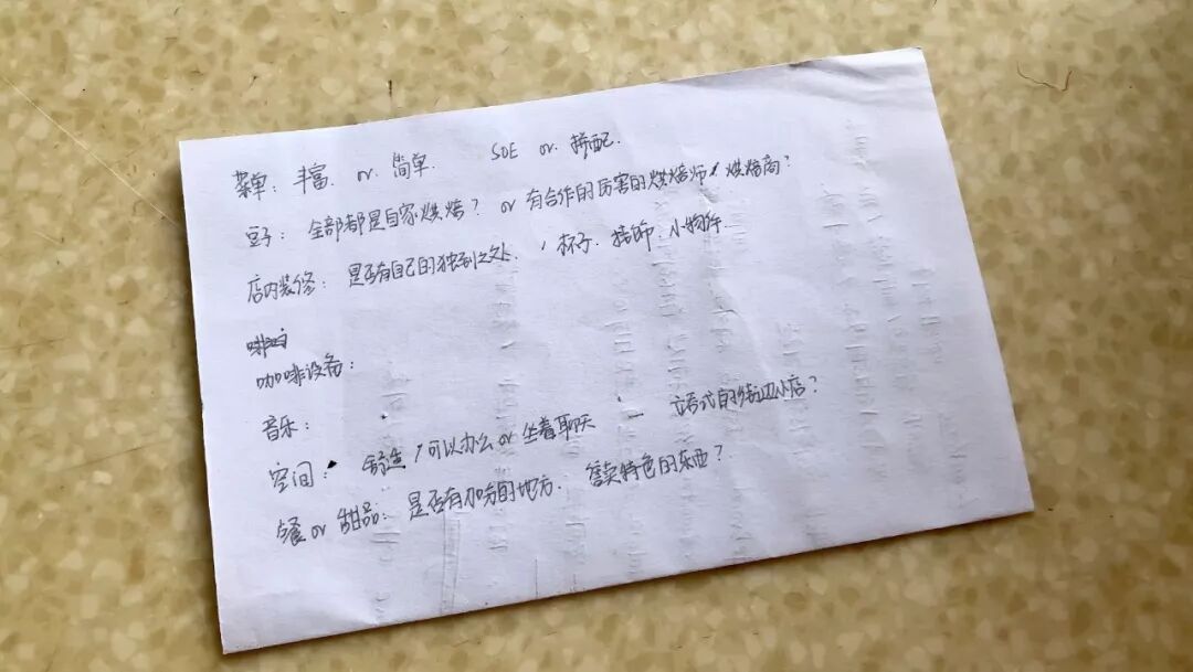 评判一家咖啡馆,需要考量的因素实在太多。康康我们探店的时候自己准备的小纸条!