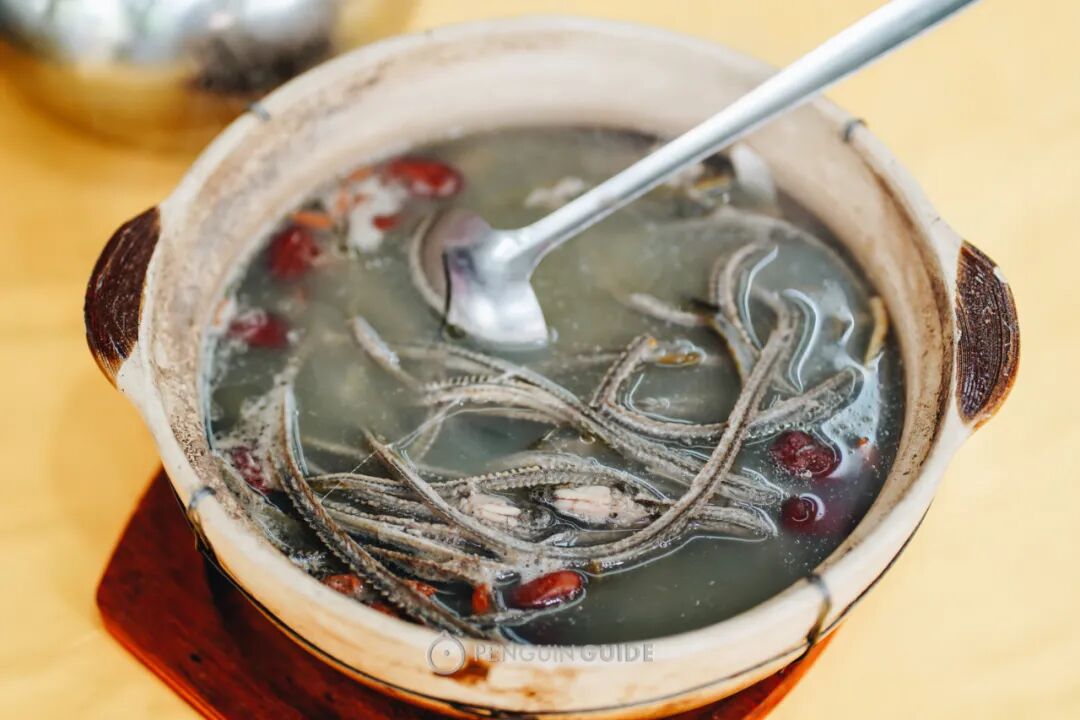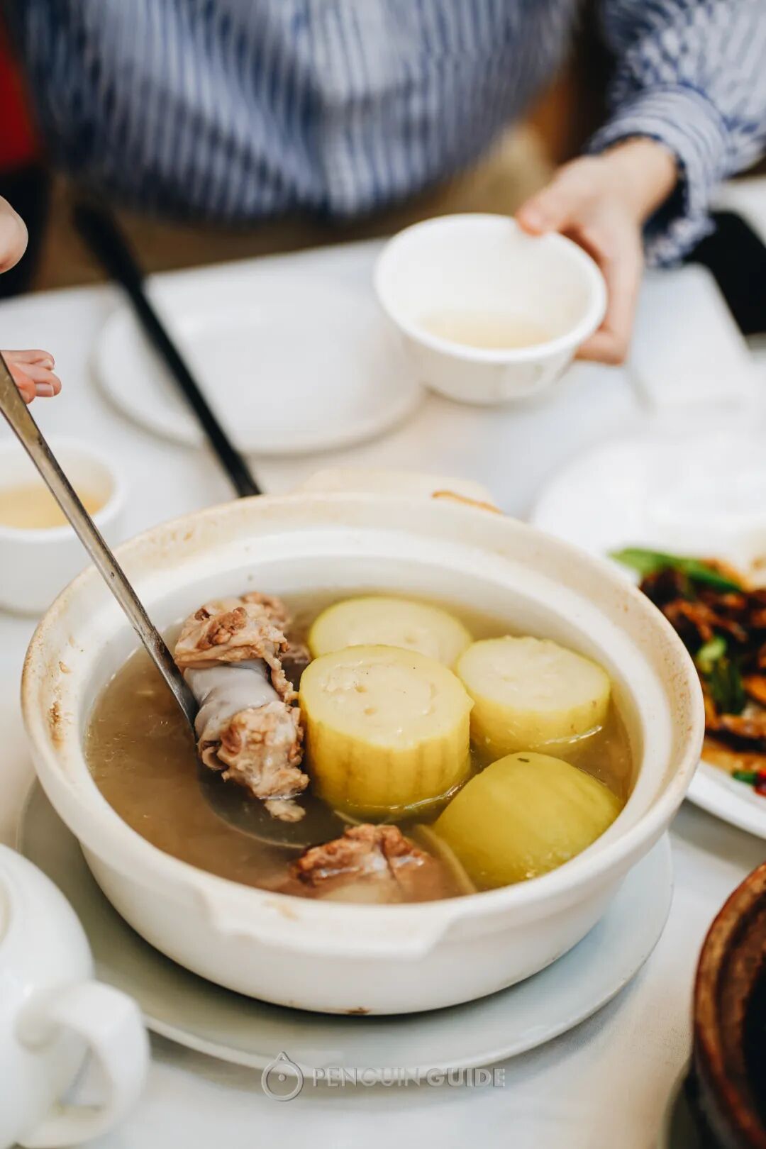 除了这两道黄鳝菜,还很推荐你点一道节瓜筒骨煲,汤头奇鲜,关键并不在节瓜,也不是筒骨,而是藏在锅底的一颗颗大干贝,完全是以本伤人。