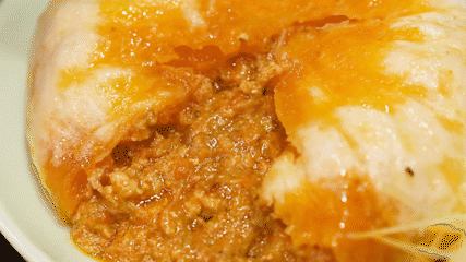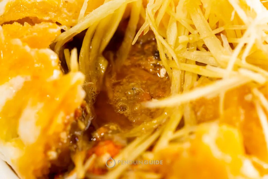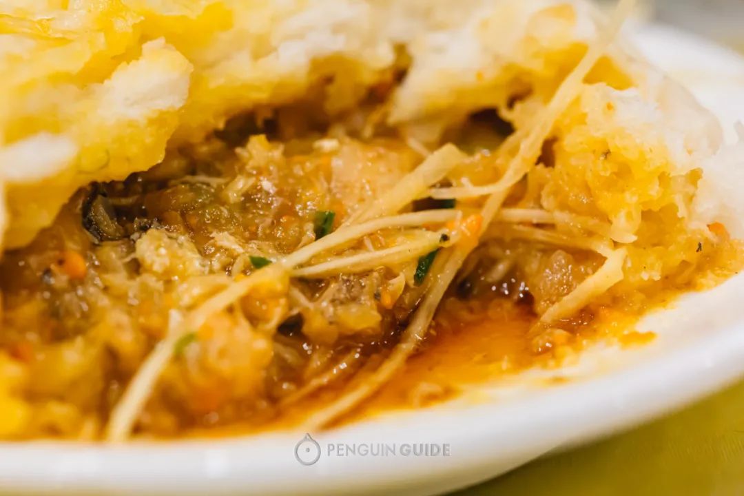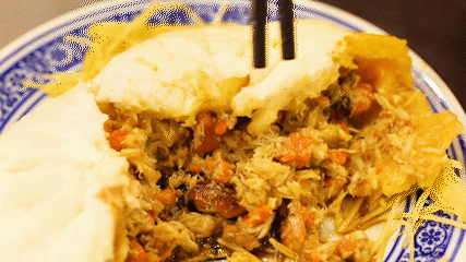 面皮被蟹油浸成金黄,温柔地包裹住蟹黄、蟹肉、猪肉皮冻的胶质馅。馅料多到得用勺子舀着吃!