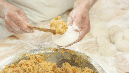 看师傅豪迈地擓了一大勺、两大勺蟹黄肉馅,又紧接着又是第三大勺,我都要担心面皮是不是要撑破了......