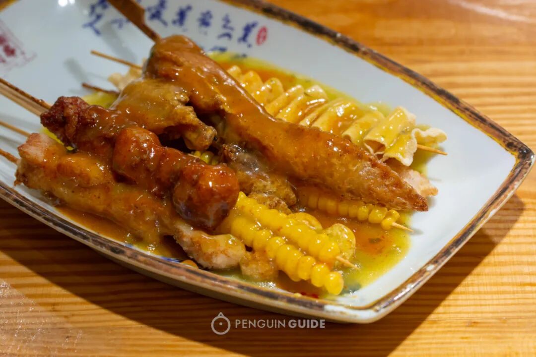 这里的炸串不裹粉,先将食材炸得外酥里嫩,再淋上店家自制的酱汁。