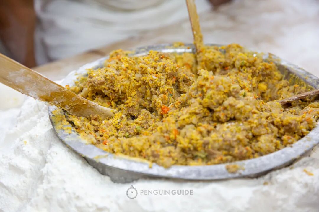 馅料由蟹黄、蟹肉、猪肉和猪皮冻混合而成。皮冻与蟹黄蟹肉的比例与灌汤包很不同。汤包的汤汁大多来自皮冻,一蒸变成汤汁;而蟹黄包的肉,就扎扎实实都是固体了!