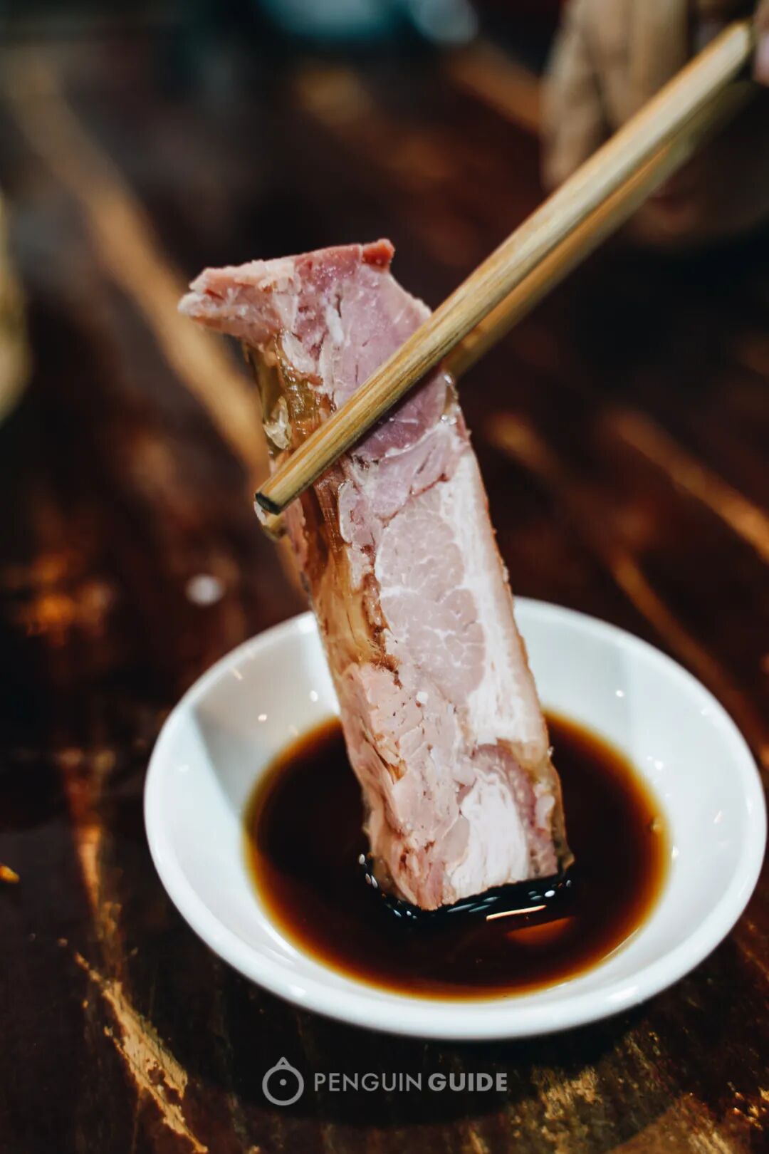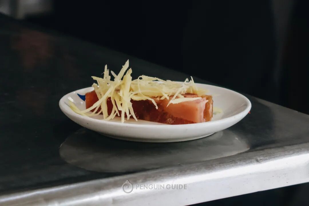 肴肉,用的是去骨的猪蹄膀部位。腌制完的肴肉,瘦的部分粉嫩粉嫩,肥的部分则有着水晶般的剔透。