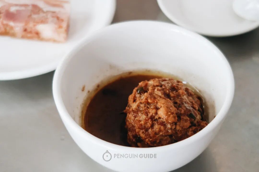 一块是占肉,就是狮子头。拳头般大,口感松软、细腻、鲜香。可以直接吃,也可以下到面里做浇头吃。