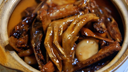 广东人的餐桌上习惯以鸡为王,但韶关偏不,当地擅长养鸭,所以能把鸭子煮出花来。推荐你点这道鸭五件,将鸭子最不被重视的鸭翅、鸭脖、鸭头、鸭下巴、鸭掌,全数融入这浓稠的酱汁中,猛火逼出一锅郁香。