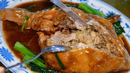 招牌就是一味怀旧功夫菜,八宝鸭。这道几近式微的怀旧粤菜,据说是一些老师傅年轻时的噩梦,因为,当年要考粤菜厨师技能证,做好一只八宝鸭就是试题。