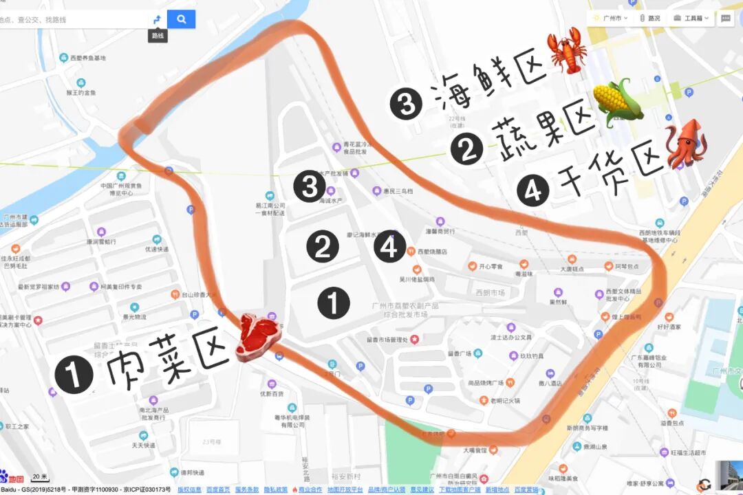 它有多大呢?不过是区区的5万平方米。随手在地图上圈一下范围(请原谅我灵魂画手),一般的街区市场,都是一个区域内容纳了所有品类,但荔塱市场呢,是一个品类占了一整个区域!