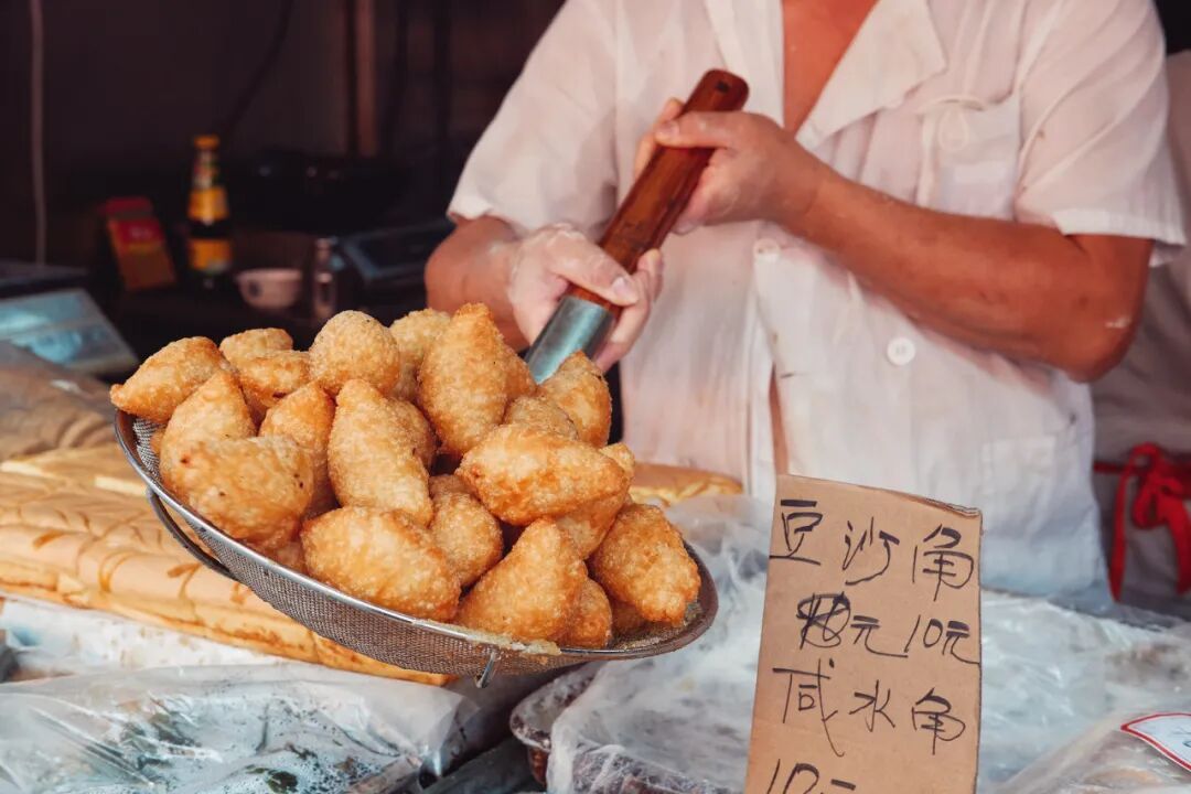 你甚至能碰到新鲜炸出来的咸水角和豆沙角。8-10元一斤。