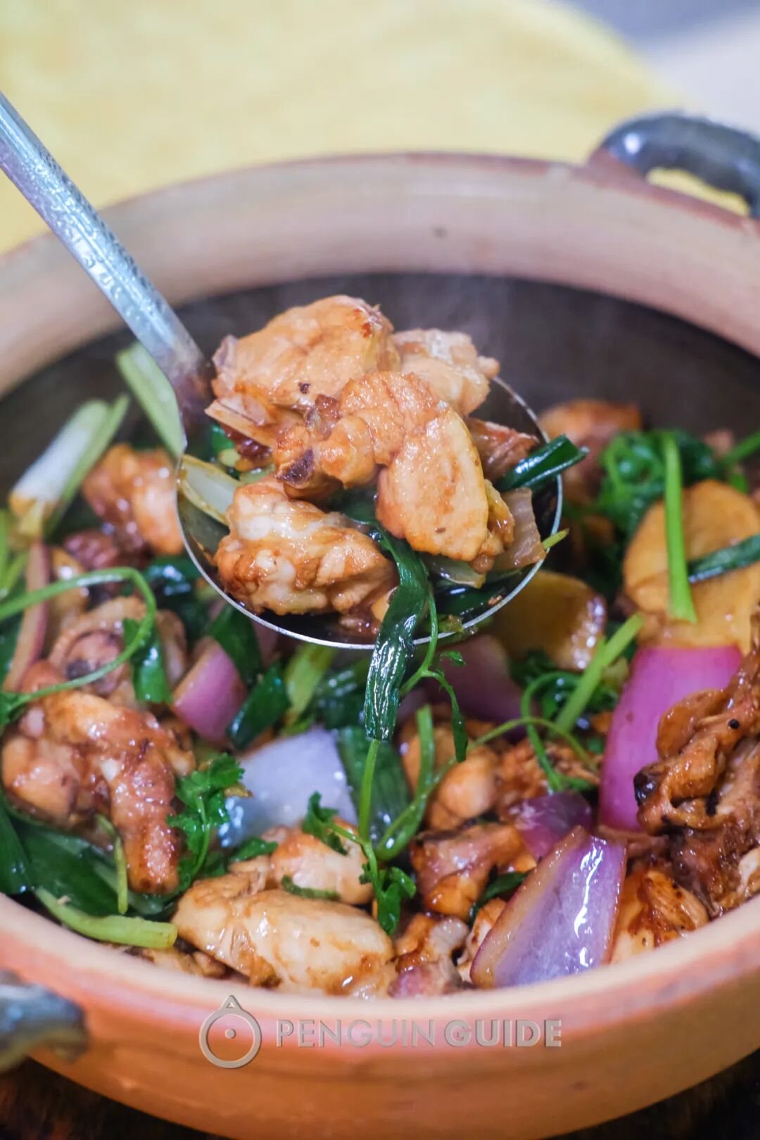 推荐你们来个一鸡两吃,就是可以点菜单上任意两个鸡煲,选择鸡煲时也建议以一湿一干两种做法搭配。“湿式做法”也就是带汤的意思,我们就点了这道抽湿鸡。