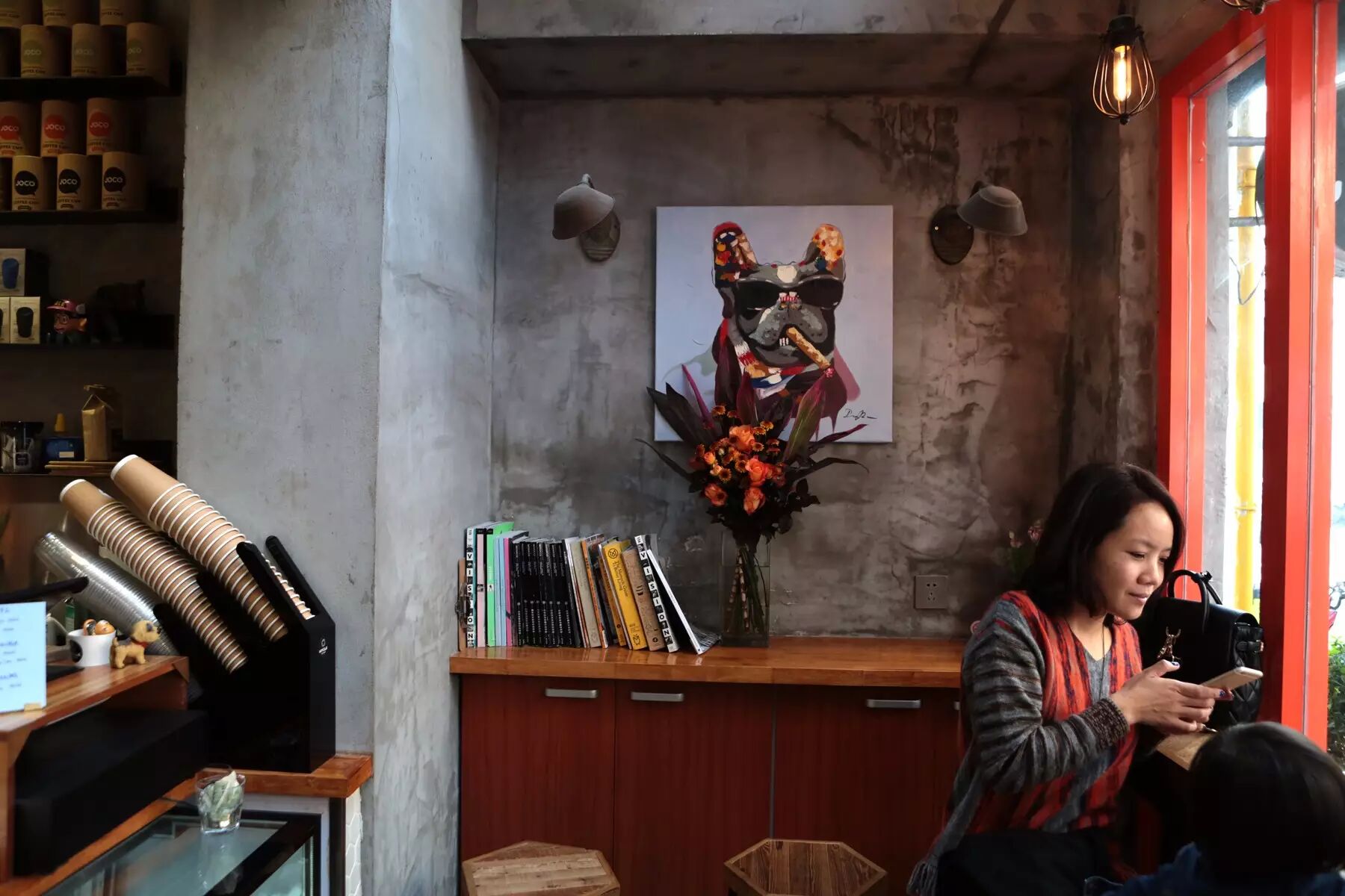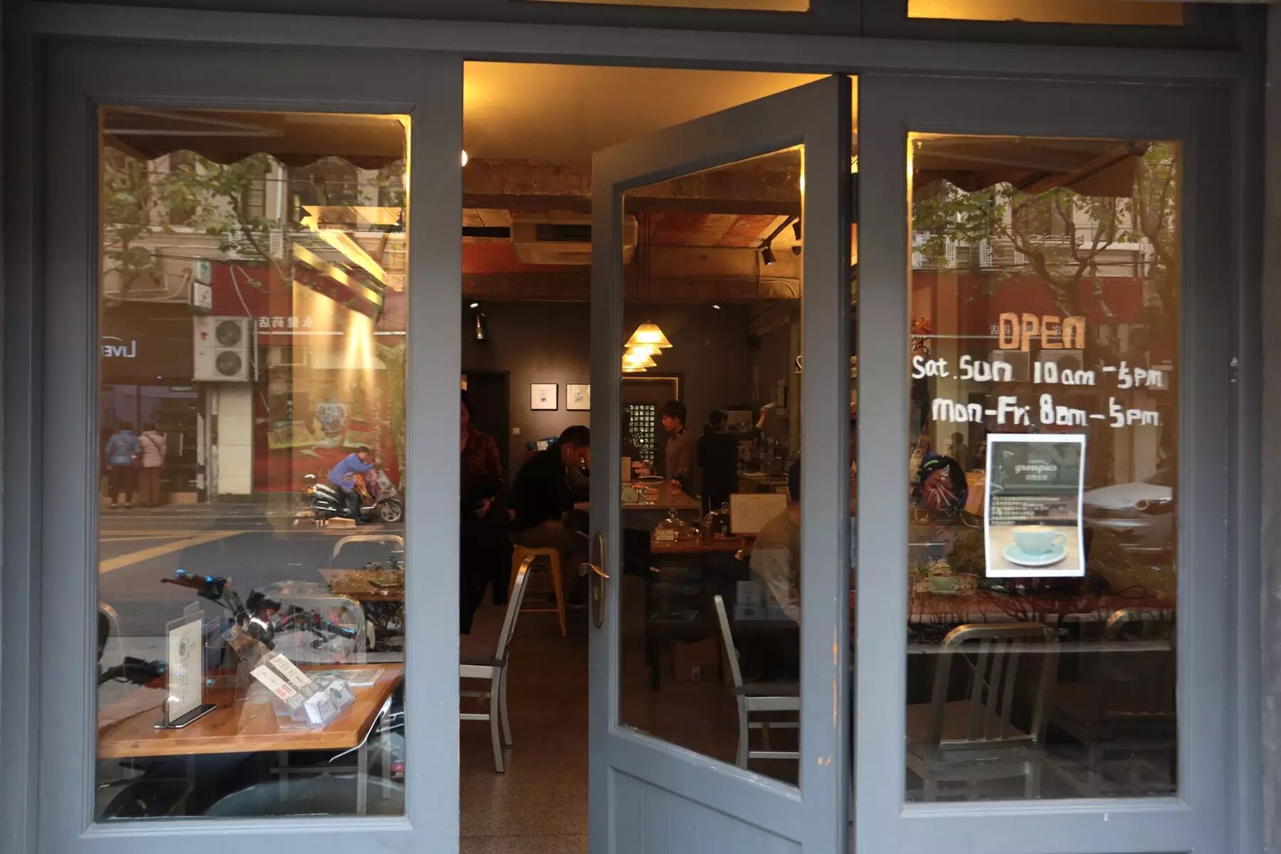 上海不能有比这家更小的咖啡馆了吧?!只有两平米!外带小窗口旁,就是超级酷的小小意式机,可以零距离观看咖啡师制作咖啡的整个过程。两平米的店里,当然没有坐下喝咖啡的地方,于是店外贴心地放了一排长凳让大家歇脚喝咖啡,老板的白色“小牛”电动车就停在一旁。
