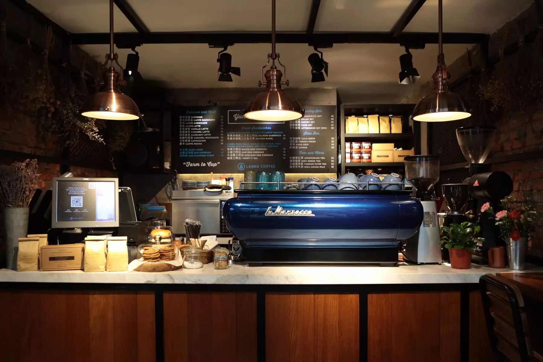 门口小小的、醒目蓝色的镂空拉花铁艺,指出了lanna的位置,墙上醒目的写着lanna的使命:推广云南咖啡豆。店面小小的、却塞下FB70三头咖啡机,足见店主希望呈现好咖啡的决心,而店内所有的豆子都来自他们自己在云南的庄园。