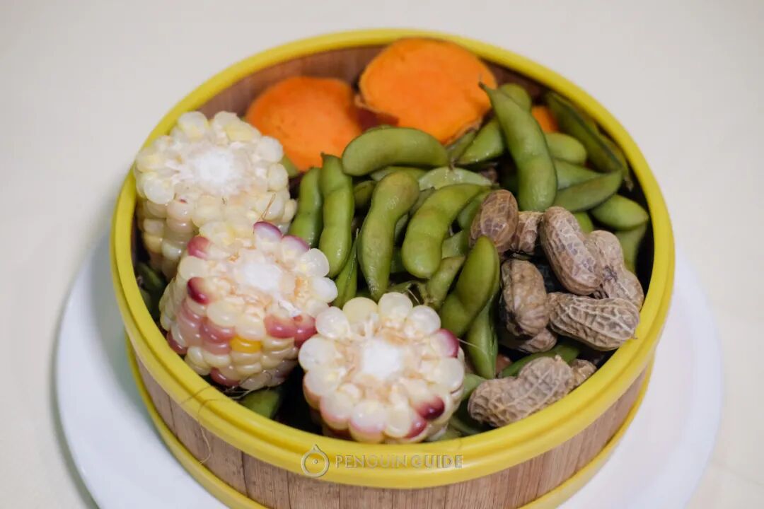 前菜呢,直接上来一大份粗粮,毛豆、花生和番薯都获得好评。