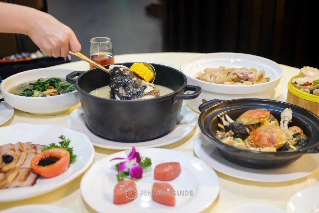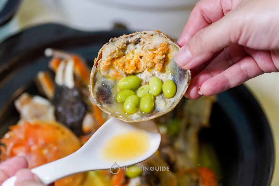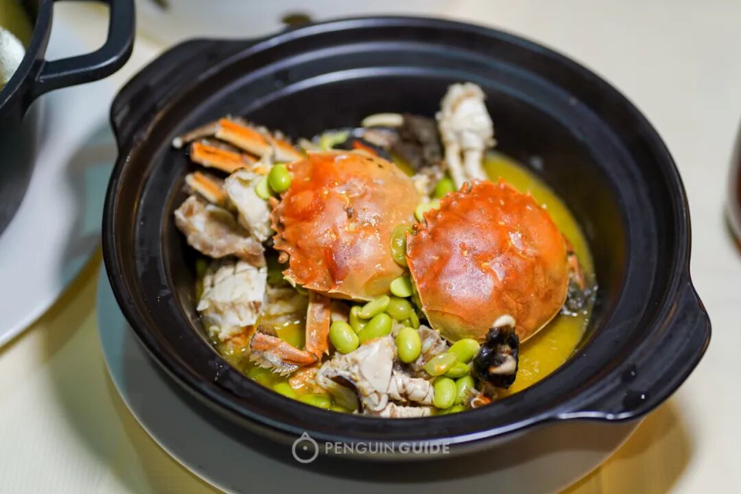 比如这道毛豆咸猪骨大闸蟹煲,用当季的大闸蟹配广东咸猪骨和毛豆,思路很清奇,普通粤菜馆里看不到这样的搭配。