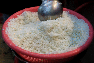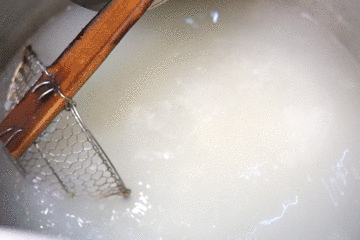 接着就是笊篱糇饭,也就是像这样把饭捞起来,排出多余的水份,变得粒粒分明。