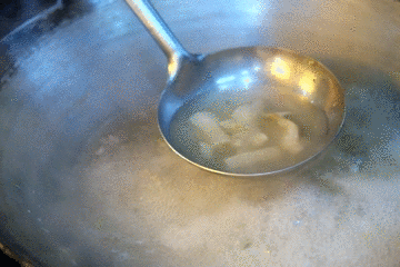 煮鳘鱼胶粥手法也很细致,需要细心地切成大小均一的薄片,放到小锅里氽烫,刚刚卷曲断生,再煮一下即捞起。