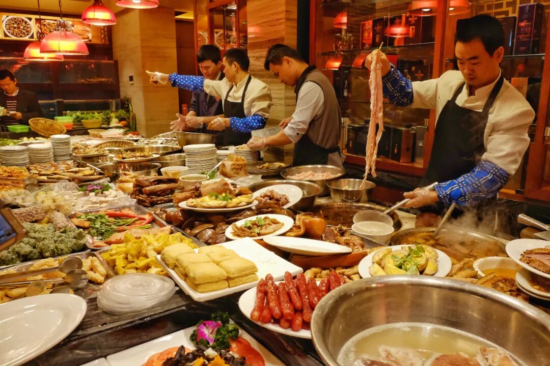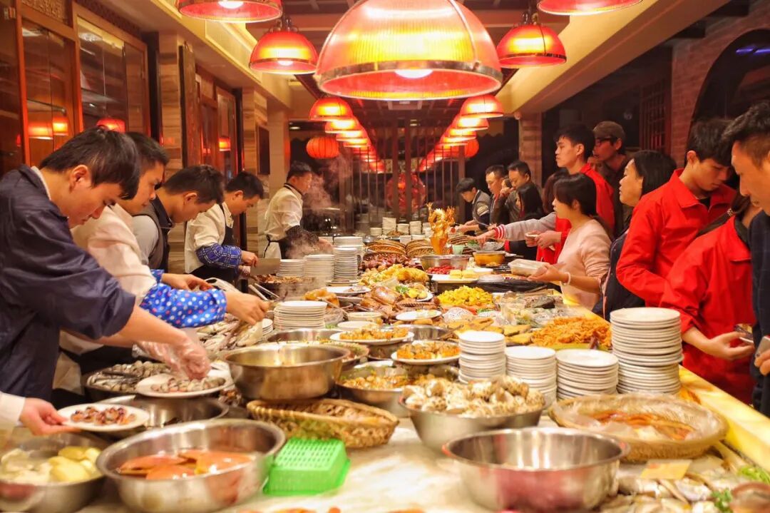 不妨来看看排场:超过15米的长台,错落有致地摆出超过500种配菜,组成一条恢弘的夜糜众生相。