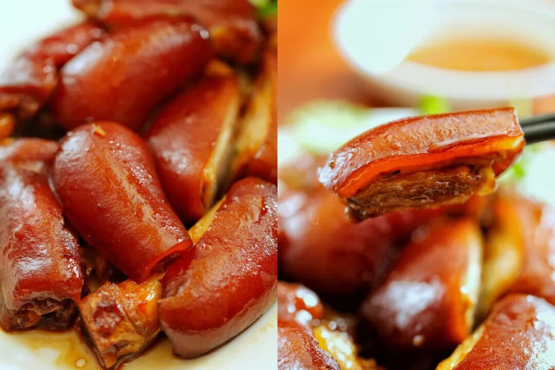 这红光透亮的猪手,阵阵卤香穿透皮脂与胶质,搭配上一碗白糜,口感更是腴而不腻。