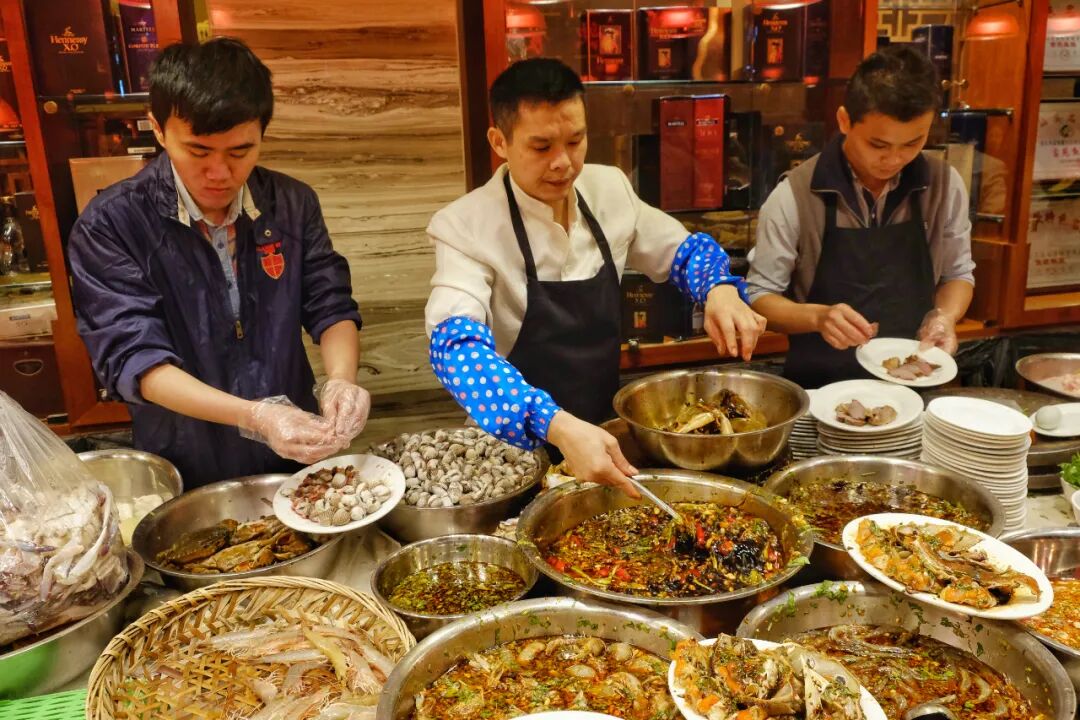 鲜活的鱼虾贝类,他们喜欢生腌;而咸水的冰鲜鱼,则会用普宁豆酱煮着吃。