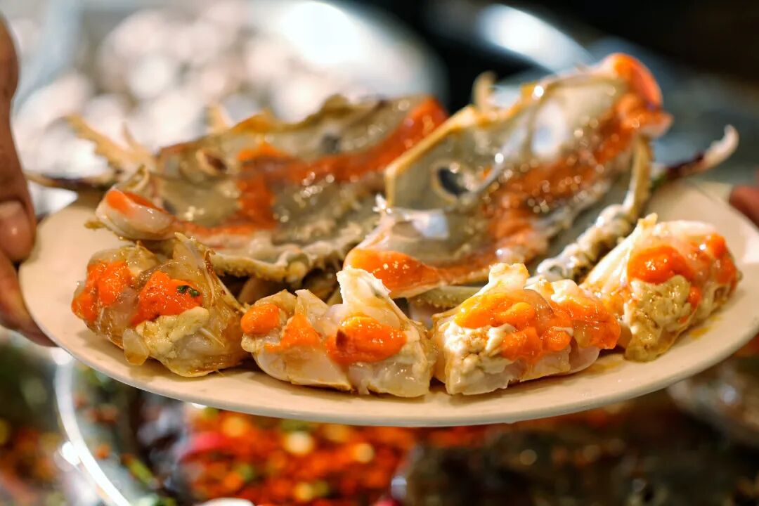 尤其是生腌蟹,蟹膏泛着盈盈橘光,蟹肉还是溏心质地,一口吮下去,晶莹的蟹肉像果冻般化在嘴里,咸鲜可与温州江蟹生比肩。