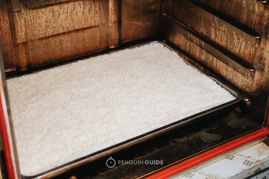 先一盆盆地把米饭蒸出来。之后倒入冷水中反复搓洗,将多余的米浆洗掉。