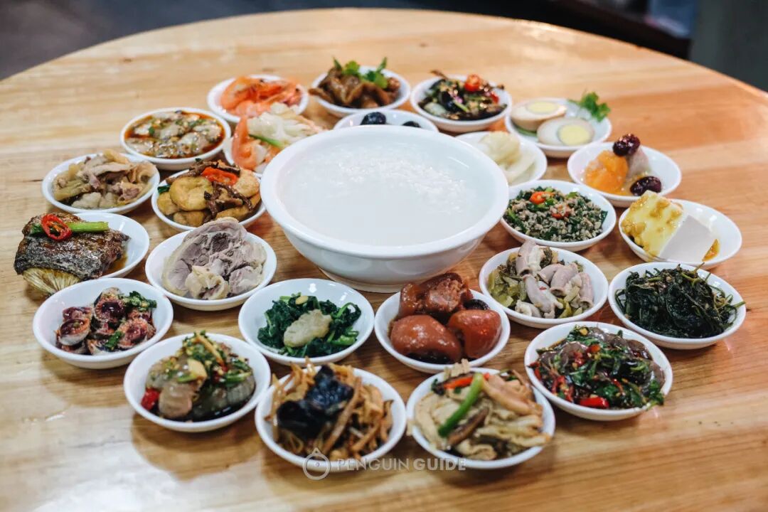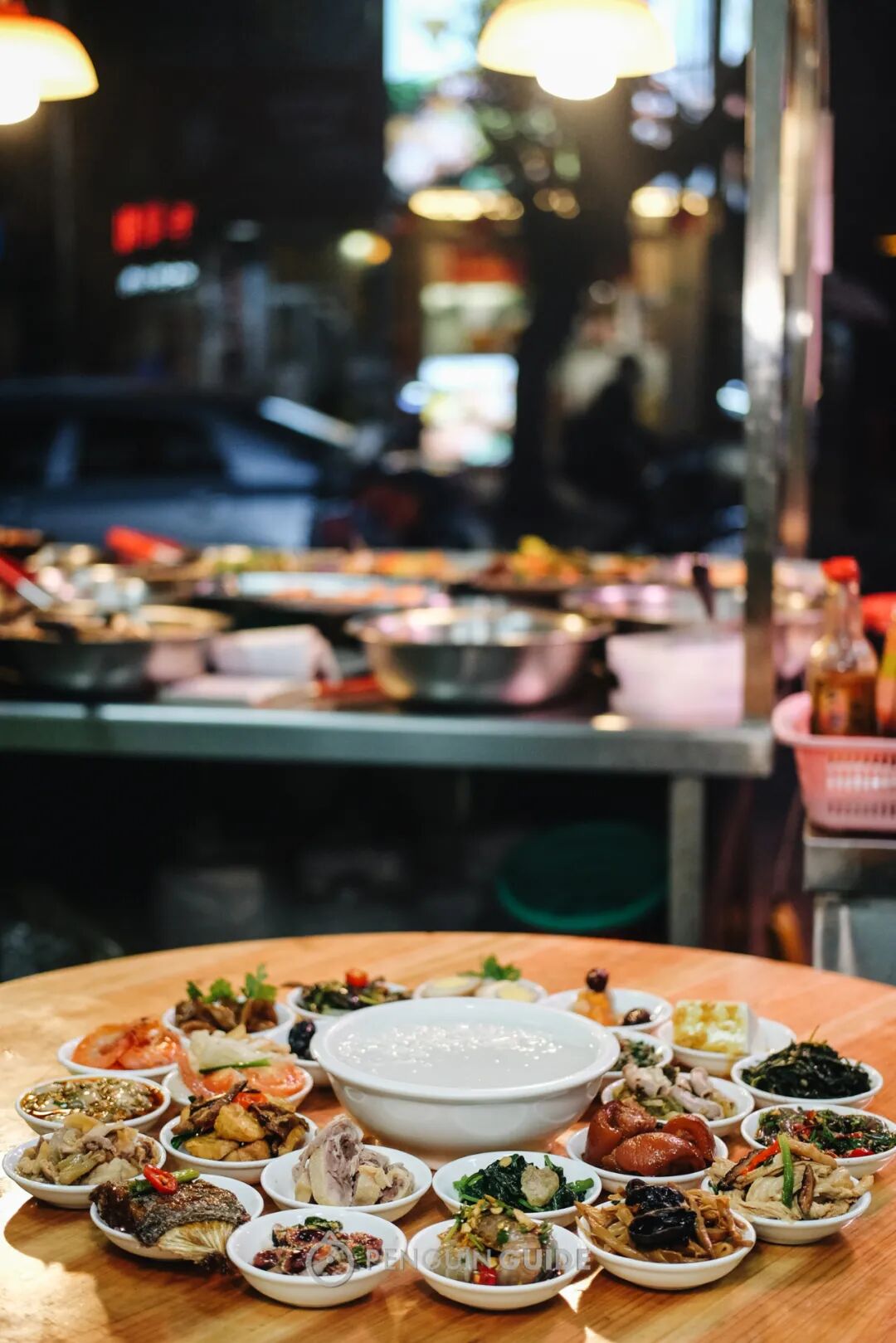 多达上百种配菜和蘸碟,食材跨越山海,下至不起眼的内脏猪油渣,上至令人胆颤的贵价海鲜,都不过是为了烘托一碗粥的存在。