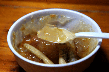 石花膏作为泉州的知名糖水,最知名的两家是秉正堂和爱啊石花膏。而这家水门啊琴姐的石花膏的做法有点特别,是一整盒凝固状的。