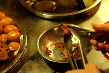 面线糊以大骨头作底,清甜,加入醋肉、大肠,还洒上一点卤汁,暖fufu香喷喷,这样的面线糊,才是深宵的安慰,睡前的晚安嘛。