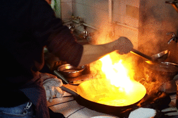 厨师就是老板,炒菜时身后站着4个人,彼此没有任何交流,却合作无间。