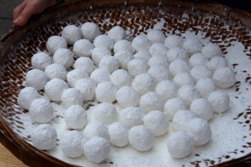 花生、芝麻分别炒制过,还要加入自家炼的葱油提香,切得细细碎碎才包入馅中,然后像这样摇啊摇出圆滚滚,全手工的细致操作,令口感更妙。