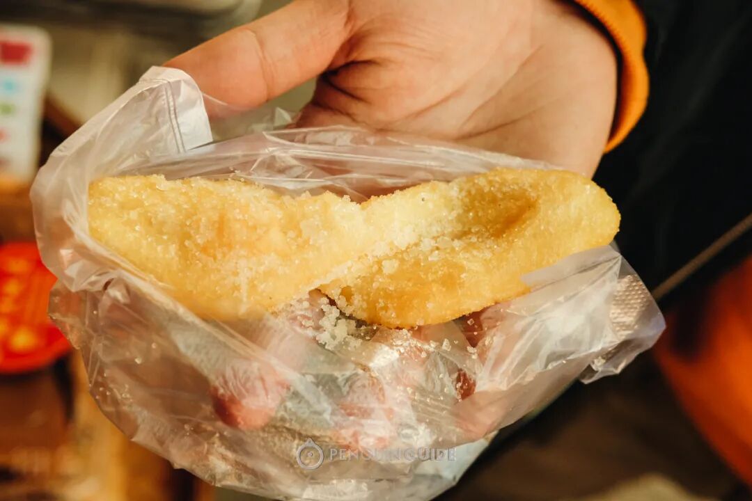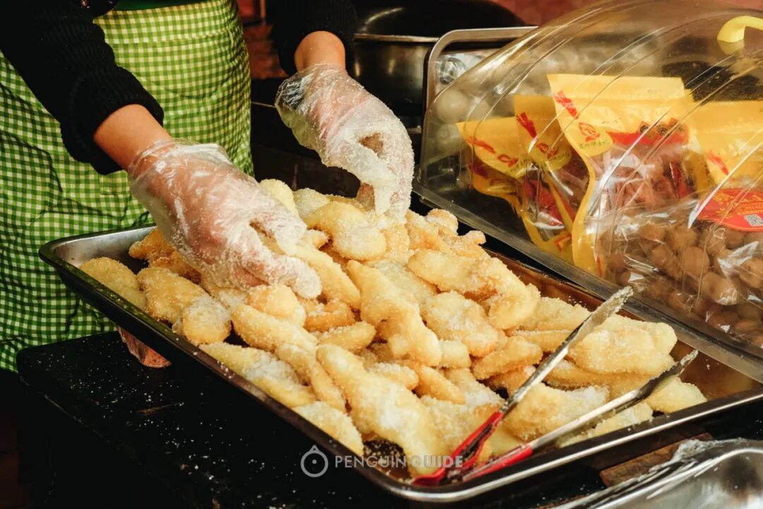 将信将疑地买了一份,真香了!有点像在咬一口油炸糯米糍,酥酥糯糯地就啃完一整个,唇上全是细细的糖霜,舌头绕一圈滚个干净~