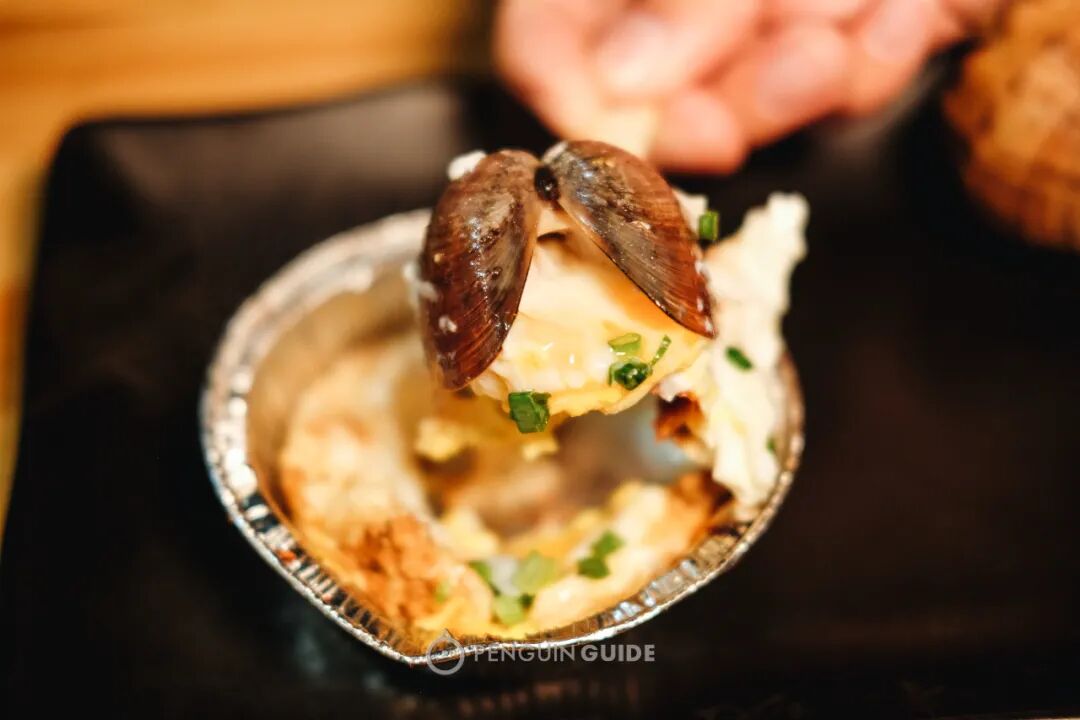 搭配上也有趣,拿了一只生鸡蛋,烤的时候放在挞皮壳里,还加一个文蛤在里面,所以鸡蛋是带有鲜味的。