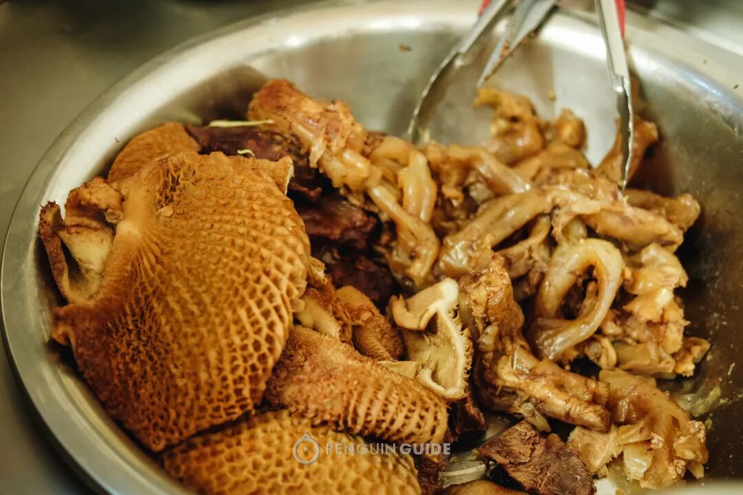全店只卖一碗牛三宝:牛腱子肉、金钱肚和牛筋,全都经过一大轮焖煮工序,下单后麻利地剪成小块,浇上一锅牛骨高汤,就好了。