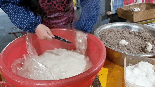 一定要去菜场吃刚出炉的热打糕:看着师傅手落锤下,把江米打成柔软的白泥。一块块带着热气落在豆粉里,打滚撒上外衣。