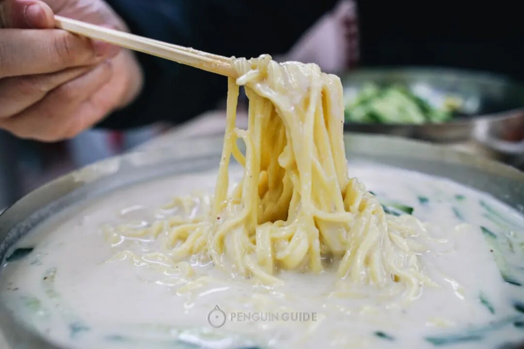 东北的大豆质量好,打出的豆浆汤底顺滑浓稠,挂汁绝了!卷起一摞,根根连汤带面,诱人得像一道风景。