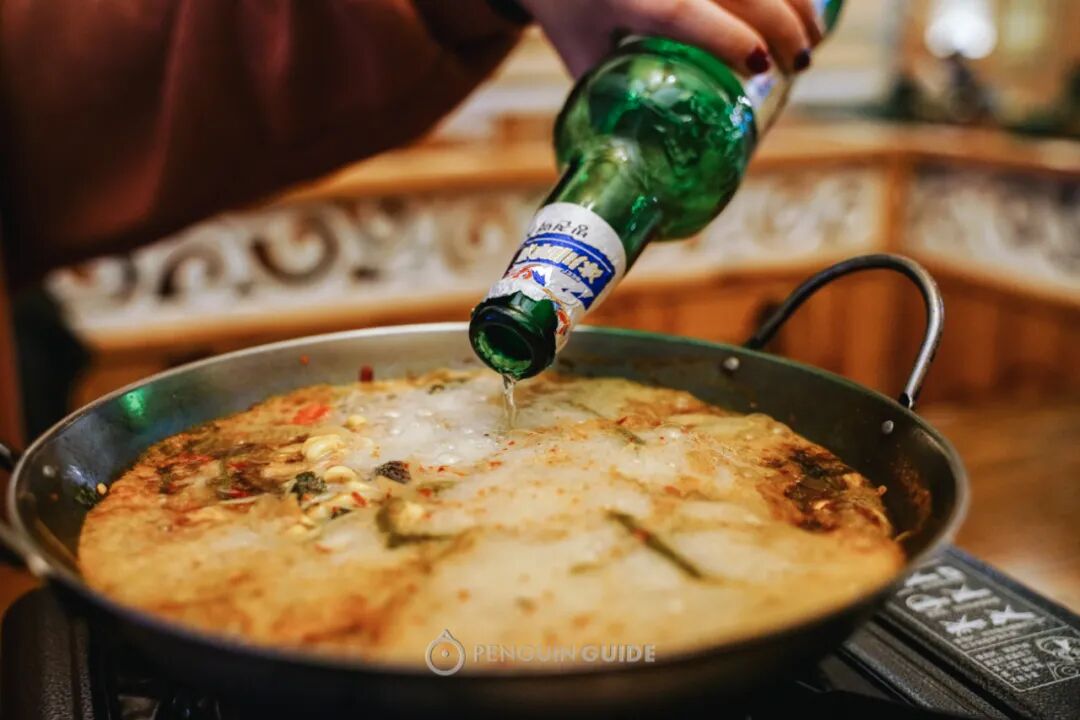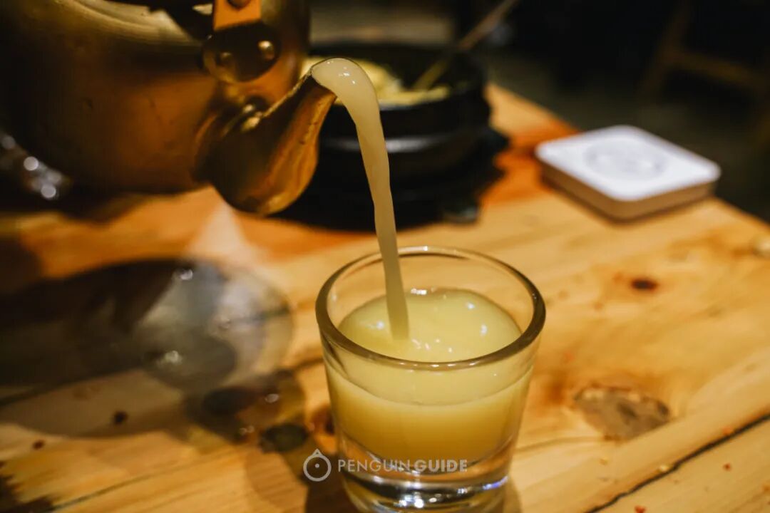 这时候,必须要来一壶米酒、一打冰川,镇住躁动的热气呀。每家啤酒屋都有自酿的米酒,朝鲜语谐音“玛格丽”。用玉米或糯米为底,加麦芽粉共同发酵。新鲜的米酒,端上桌时还在扑簌簌地冒着气泡。