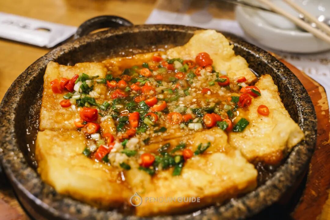 最惊艳的,应该是这道铁板豆腐用到的蒜蓉油酱,酱汁勾了薄芡,把烙出的豆腐脆皮调成了蒜香味。和水汪汪的内里,是两种质感的交锋。