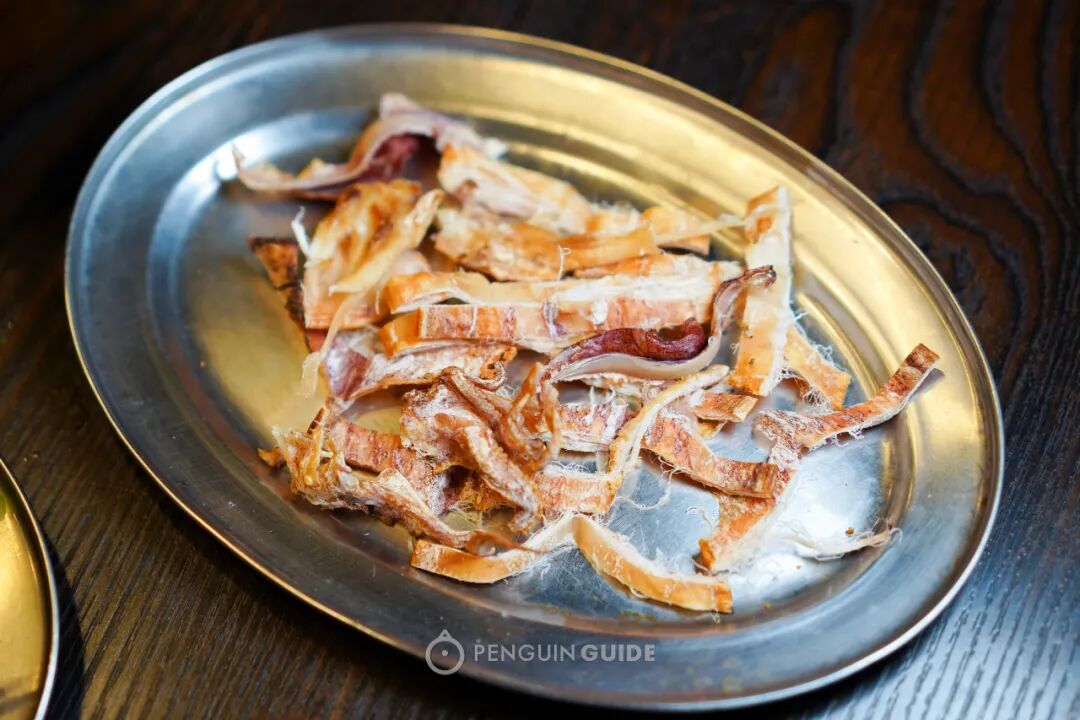 更绝的是鸡皮!因为足够新鲜,口感极其脆爽,不像一般鸡皮般软绵绵,除了油脂的迸溅感,回味还有一丝鲜甜。