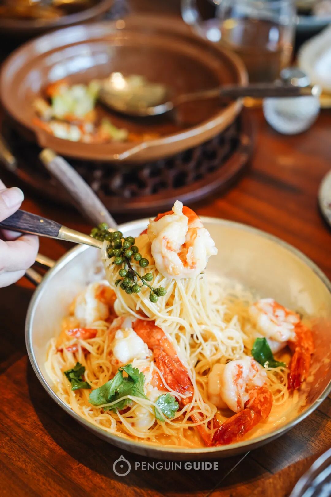 花椒鲜虾天使面,西式食材和中式调味结合得很好,虾肉弹嫩,花椒味浓而不麻。