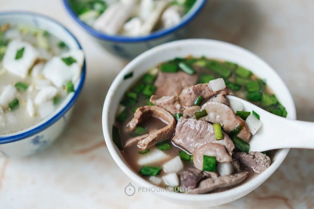 最有名的是牛三星(牛腰、牛肝、牛心),温和的药膳汤底,配上辛辣的韭菜和胡椒粉,冬天喝上一碗,很暖身。