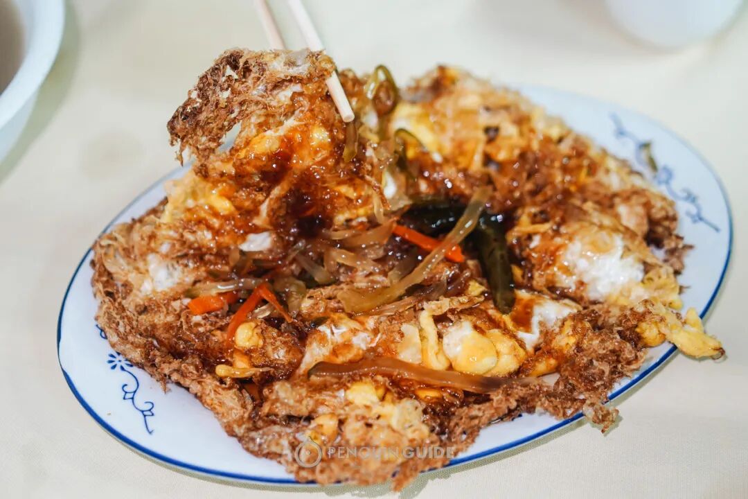 五柳炸蛋,鸡蛋炸得很到位,边缘有焦脆的蜂窝,酸甜清新。