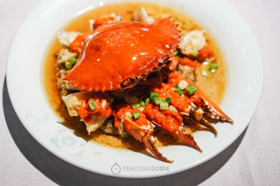 菜单上有不少贵海鲜,如果想吃得豪华些,我们会点一道台山膏蟹蒸肉饼。