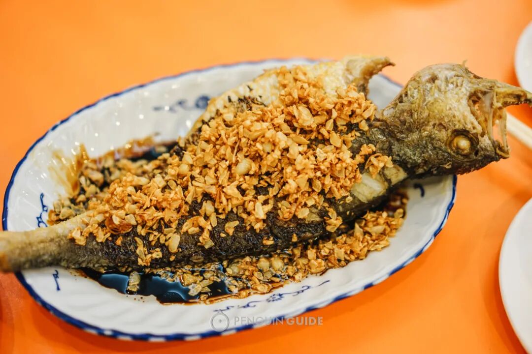 红了30多年的豉油糖黄花鱼,被不少餐厅模仿过,但跟原版比还是差口气。这盘鱼肉火候从不失手,炸蒜香酥而不苦,功夫都在细微处,眼看着它从68块涨价到98,还是愿意点。